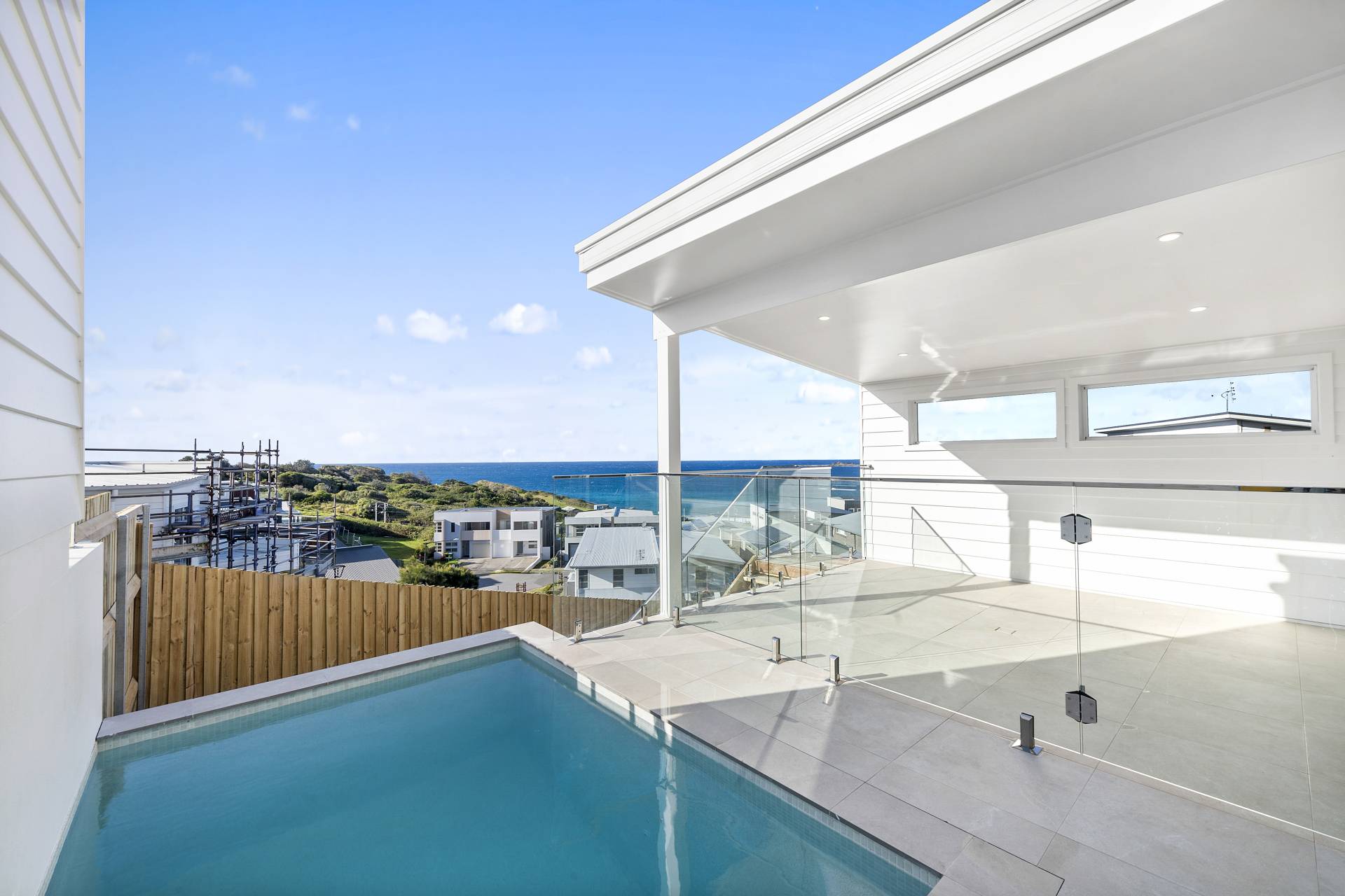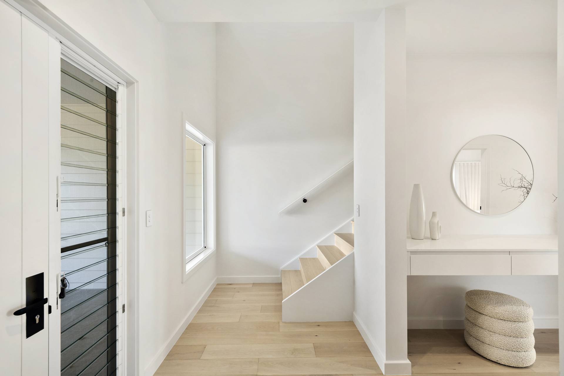 A picket-fenced front garden and deep, covered porch create a welcoming first impression, leading into a bright and airy entrance foyer. On this level, a guest bedroom is serviced by a stylish full bathroom complete with a walk-in shower. Moving beyond the well-designed laundry room with its generous storage, the hallway opens onto the large open-plan kitchen, living and dining area – a space flooded with natural light, flowing seamlessly onto a fully covered terrace and offering ocean vistas that can never be built out. This outdoor space is the ultimate setting for unwinding as well as entertaining, complete with an in-ground plunge pool perfect for leisurely post-beach dips and sundown drinks, with stairs from the terrace leading to a low-maintenance, fully fenced rear garden below.