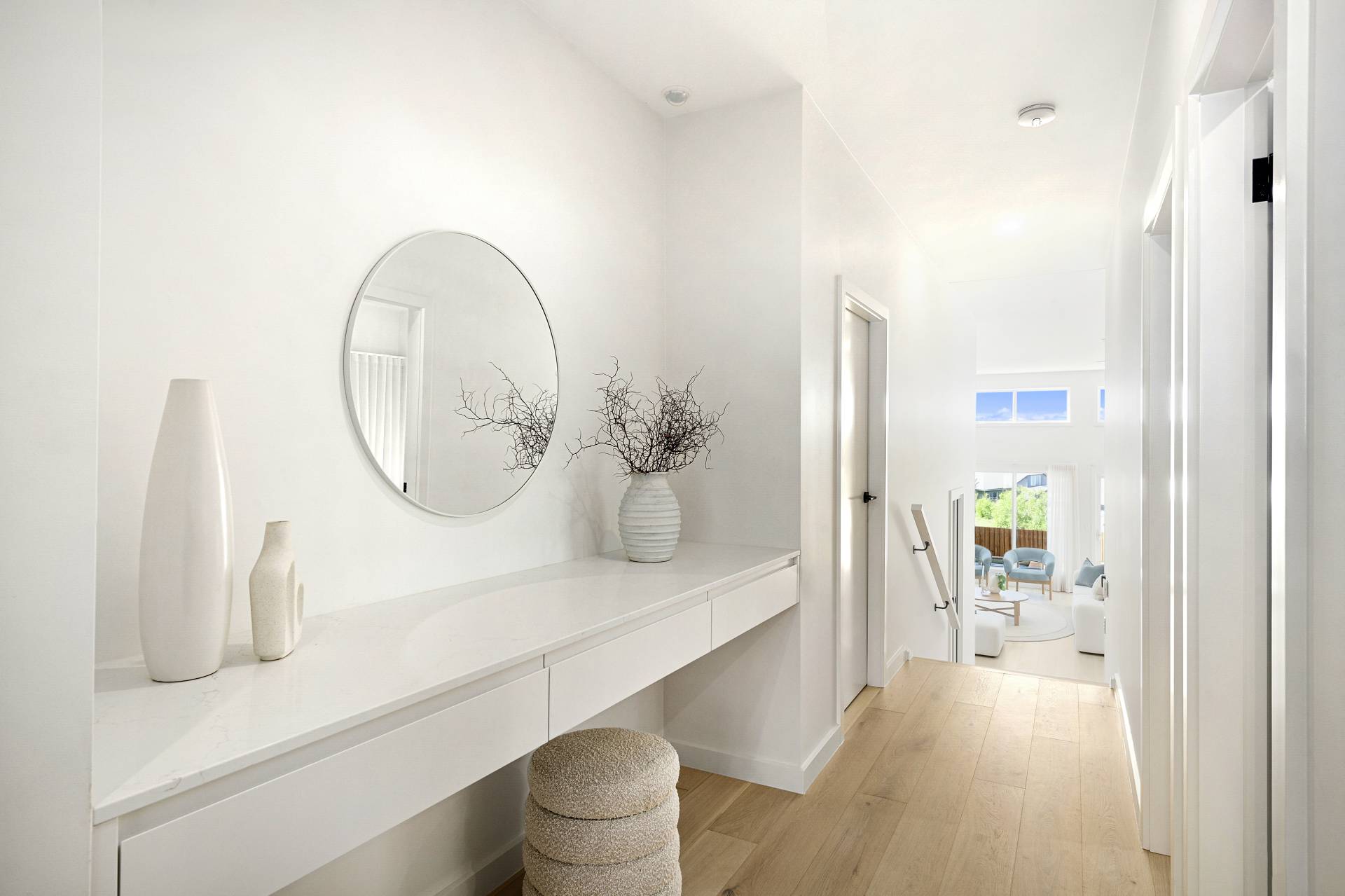The home is the embodiment of pared-back elegance with a classic palette of neutral yet warm finishes anchored by richly hued hardwood flooring and wall-to-wall pure wool carpets. Throughout, spaces are enhanced by above-standard 3m high ceilings and windows thoughtfully positioned to maximise natural light and frame breathtaking ocean views, creating a restful, peaceful ambience to relish.