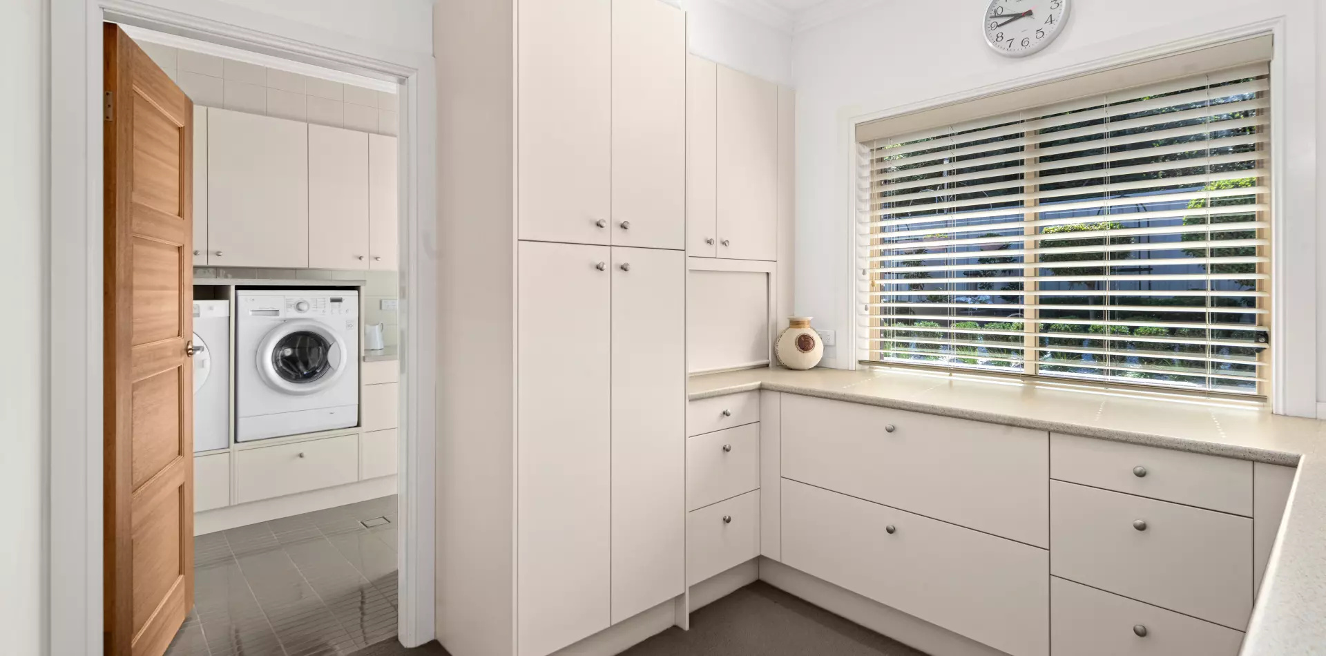 Through double entry doors, the attention to detail is evident: 9-foot ceilings, stepped cornices, solid timber doors and precision finishes throughout. On this level, a self-contained guest wing offers independence and comfort, complete with its own lounge, kitchen, bedroom and bathroom. Step out onto the timber-decked verandah — the perfect spot for a quiet read or a relaxed afternoon drink.