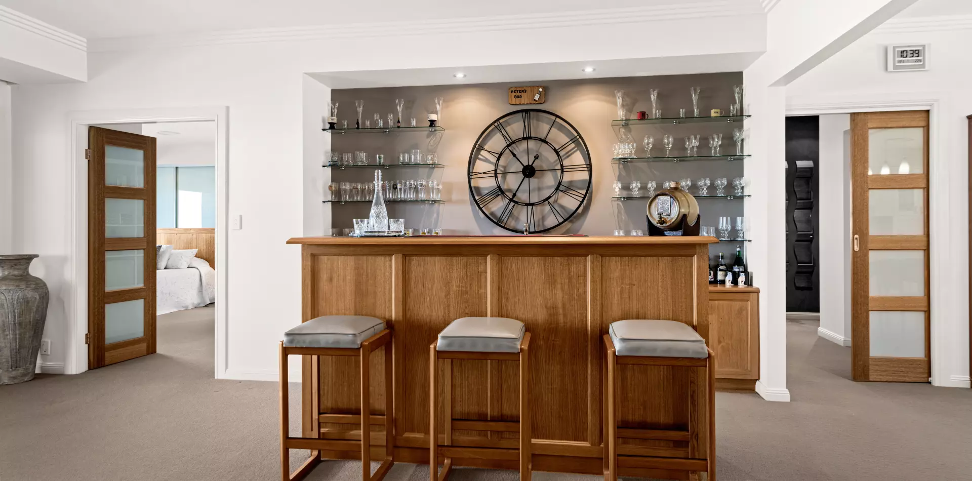 Step into the cavernous double garage, with 3.3-metre ceilings and a 4000kg hoist, and you’ll immediately appreciate the raw beauty of its formed concrete structure — visible across both levels. Adjacent, the ‘man cave’ is literally carved from the rock itself, a striking reminder of the home’s solid foundations.