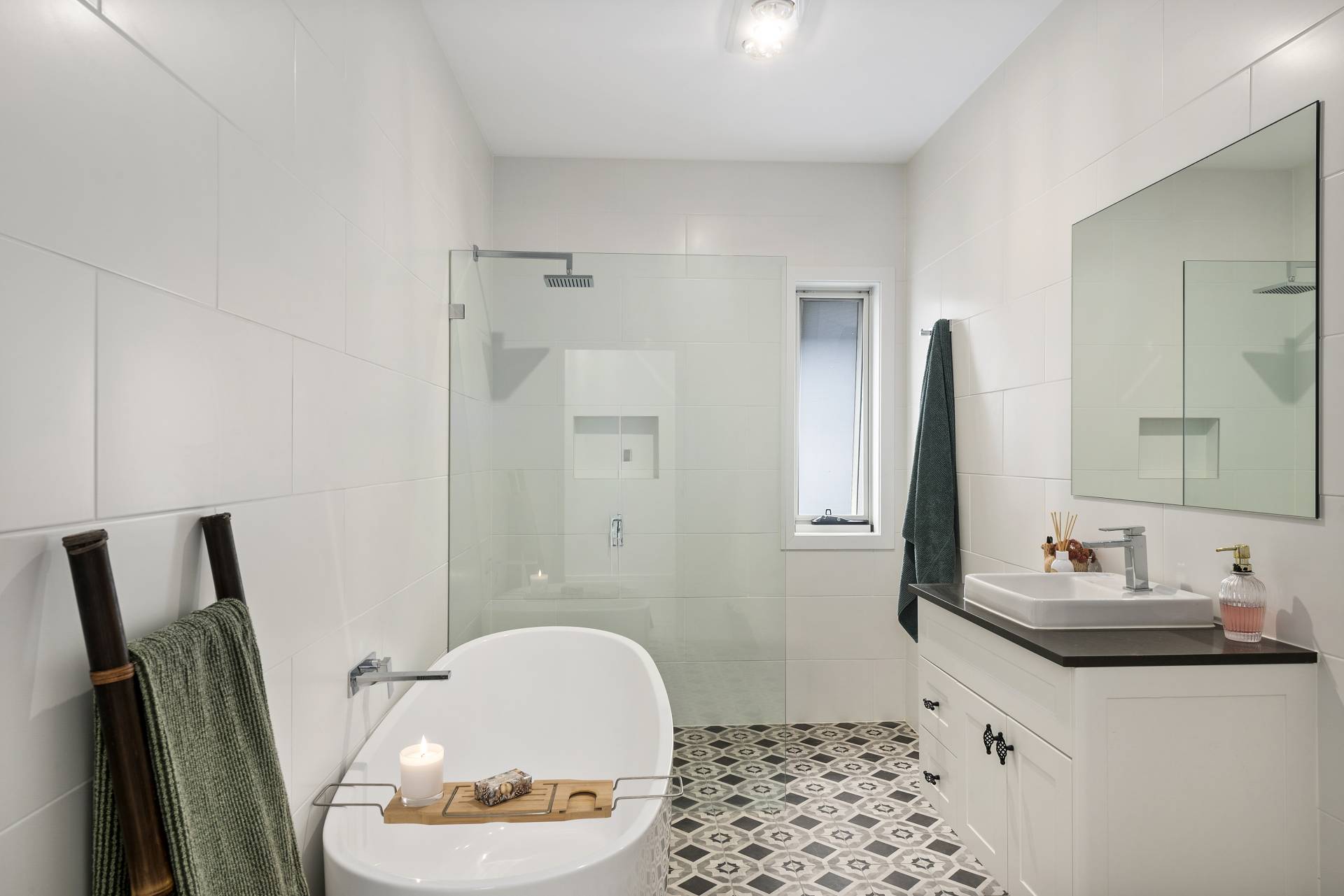 The entrance level features an inviting foyer and wide hallway leading to three generously-sized bedrooms, including the principal suite positioned at the rear of the house, with walk-through ‘his & hers’ dressing spaces leading to an ensuite bathroom featuring walk-in frameless glass shower and double vanity, highlighted by floor-to-ceiling porcelain tilework and a stunning tessellated tile floor. Completing the rooms on this level is a study located directly off the foyer, while further along the hallway are two double bedrooms, each with built-in wardrobes, as well as a beautifully appointed family bathroom with free-standing bathtub and walk-in shower, the space again finished with floor-to-ceiling tiling and tessellated tile floor.