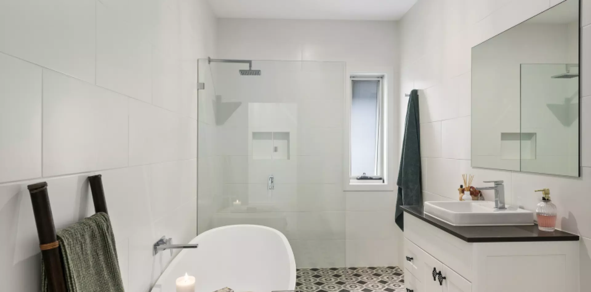 The entrance level features an inviting foyer and wide hallway leading to three generously-sized bedrooms, including the principal suite positioned at the rear of the house, with walk-through ‘his & hers’ dressing spaces leading to an ensuite bathroom featuring walk-in frameless glass shower and double vanity, highlighted by floor-to-ceiling porcelain tilework and a stunning tessellated tile floor. Completing the rooms on this level are a home office/study located directly off the foyer, while further along the hallway are two double bedrooms, each with built-in wardrobes, as well as a beautifully appointed family bathroom with free-standing bathtub and walk-in shower, the space again finished with floor-to-ceiling tiling and tessellated tile floor.