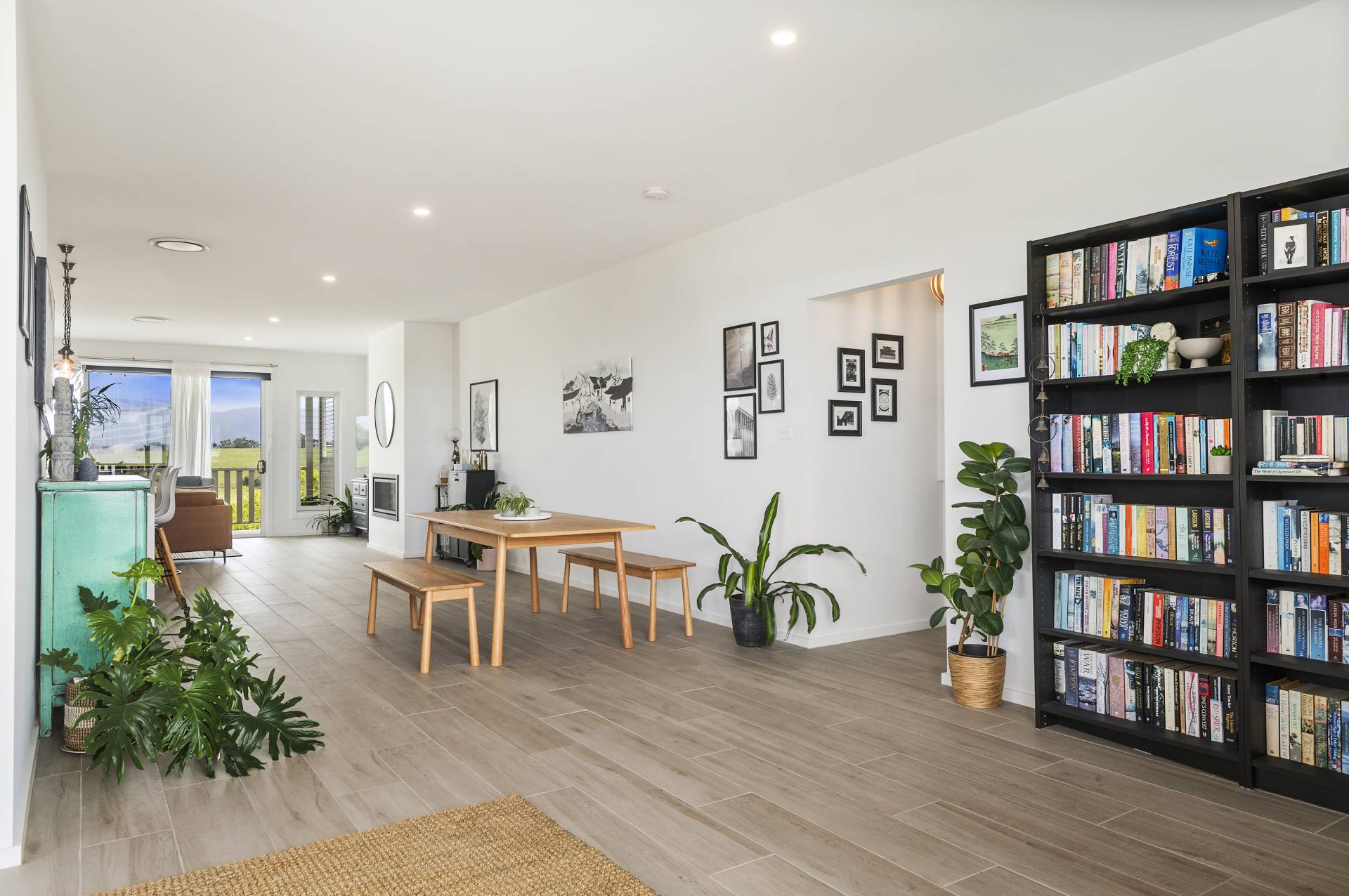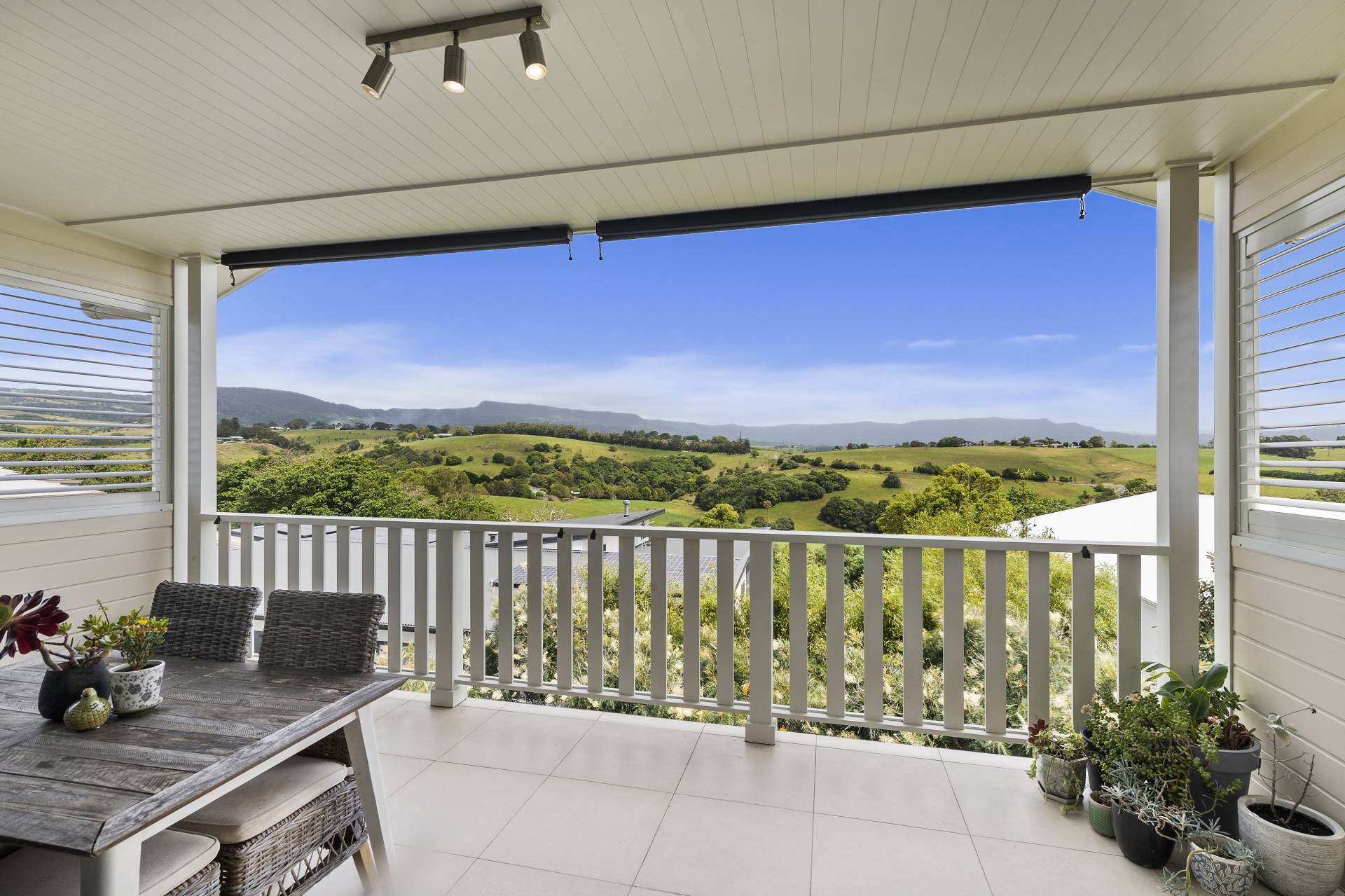 A second half flight of stairs leads from the entrance foyer to the home’s upper level, an entire floor dedicated to the routine of daily life –kitchen, dining and living spaces flowing seamlessly one into the next under a ceiling of above-standard height, with a fireplace enhancing comfort and ambience year-round, lending the feel of a quintessential country house great hall. The impressive kitchen boasts quality stainless steel appliances, stone benchtops and a large dine-at island bench; an adjoining butler’s/prep pantry with sink and dishwasher housed in bespoke cabinetry offers ample storage and preparation space, effectively doubling the overall size of the kitchen. Generously-proportioned living and dining zones form the remainder of the upper storey, each end of the space opening onto undercover balconies perfect for drinking in the uninterrupted views with drink in hand.