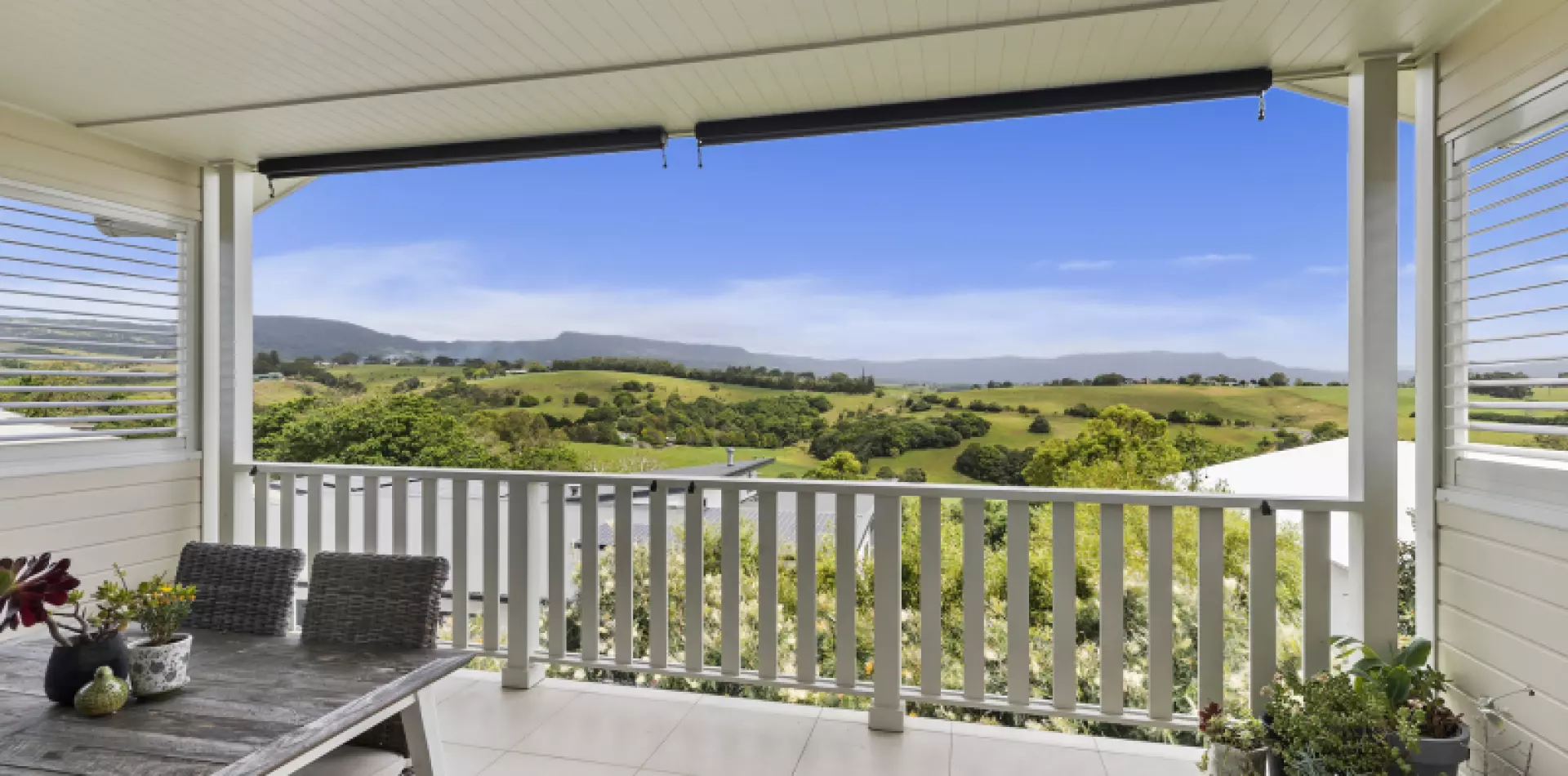 A second half flight of stairs leads from the entrance foyer to the home’s upper level, an entire floor dedicated to the routine of daily life –kitchen, dining and living spaces flowing seamlessly one into the next under a ceiling of above-standard height, lending the feel of a quintessential country house great hall. The impressive kitchen boasts quality stainless steel appliances, stone benchtops and a large dine-at island bench; an adjoining butler’s/prep pantry with sink and dishwasher housed in bespoke cabinetry offers ample storage and preparation space, effectively doubling the overall size of the kitchen. Generously-proportioned living and dining zones form the remainder of the upper storey, each end of the space opening onto undercover balconies perfect for drinking in the uninterrupted views with drink in hand.