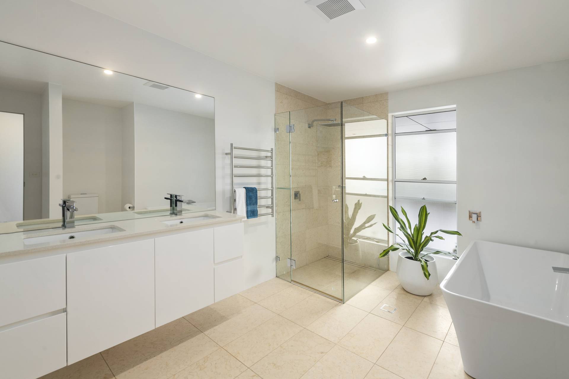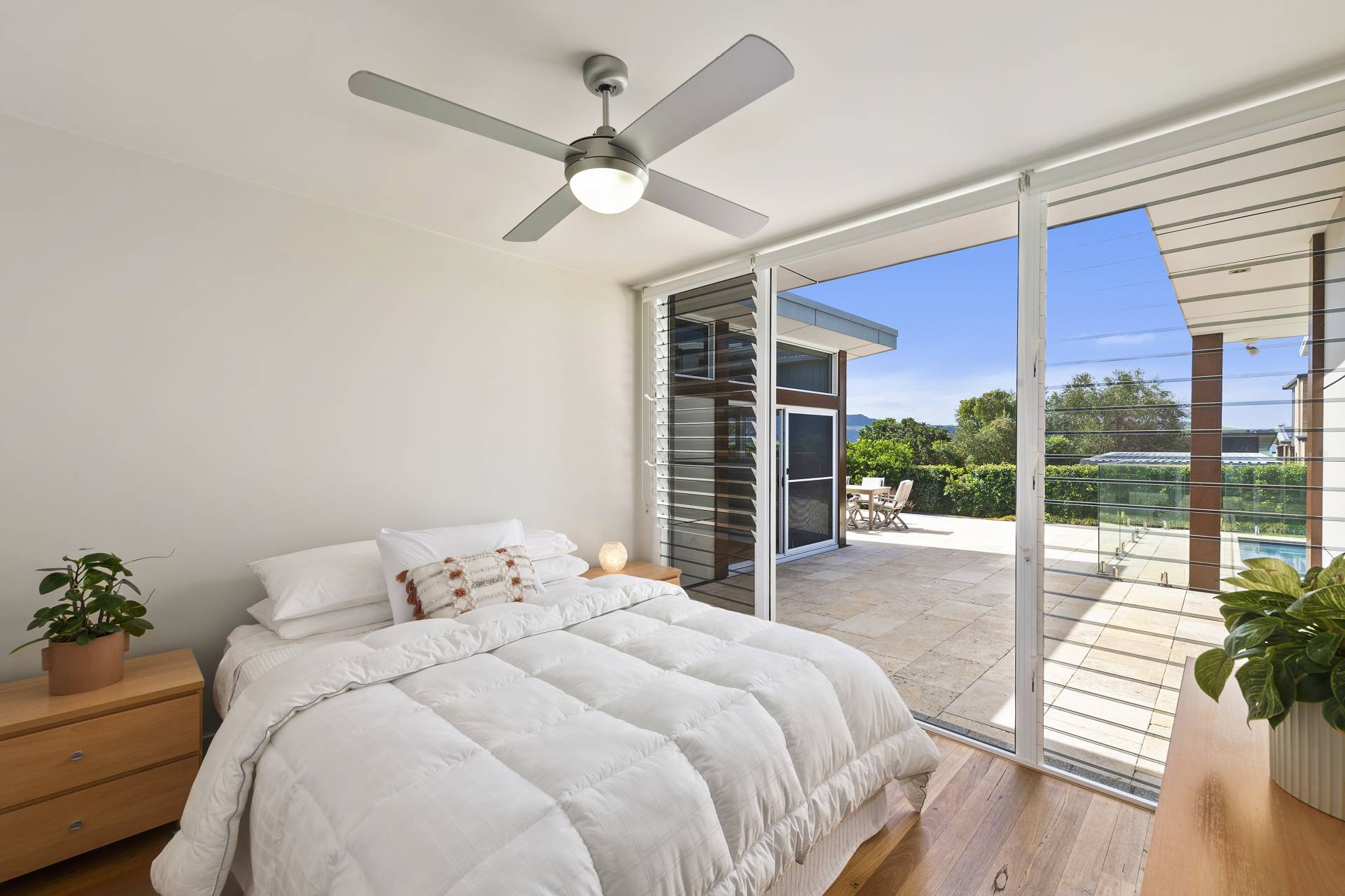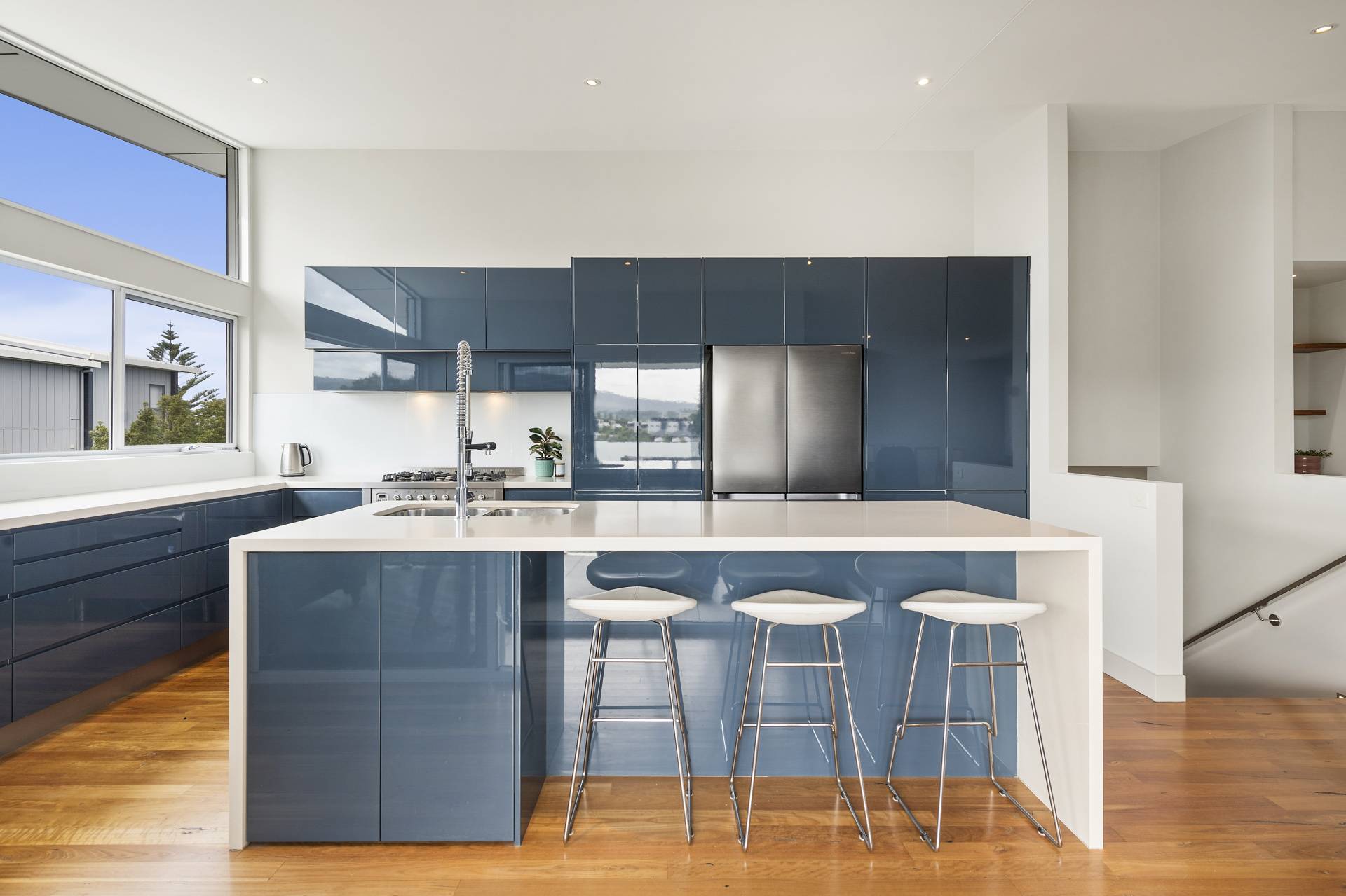 From the street, the home’s bold skillion roofline, expanses of floor‑to‑ceiling glazing and custom masonry in a muted, white‑flecked grey create an immediate sense of sophistication. Inside, the tone is set by an impressive entrance foyer where extra‑height ceilings and clerestory windows bathe the space in natural light. Blackbutt hardwood floors flow through the public areas, complemented by stainless steel balustrades and a refined palette that enhances the home’s coastal-modern aesthetic.