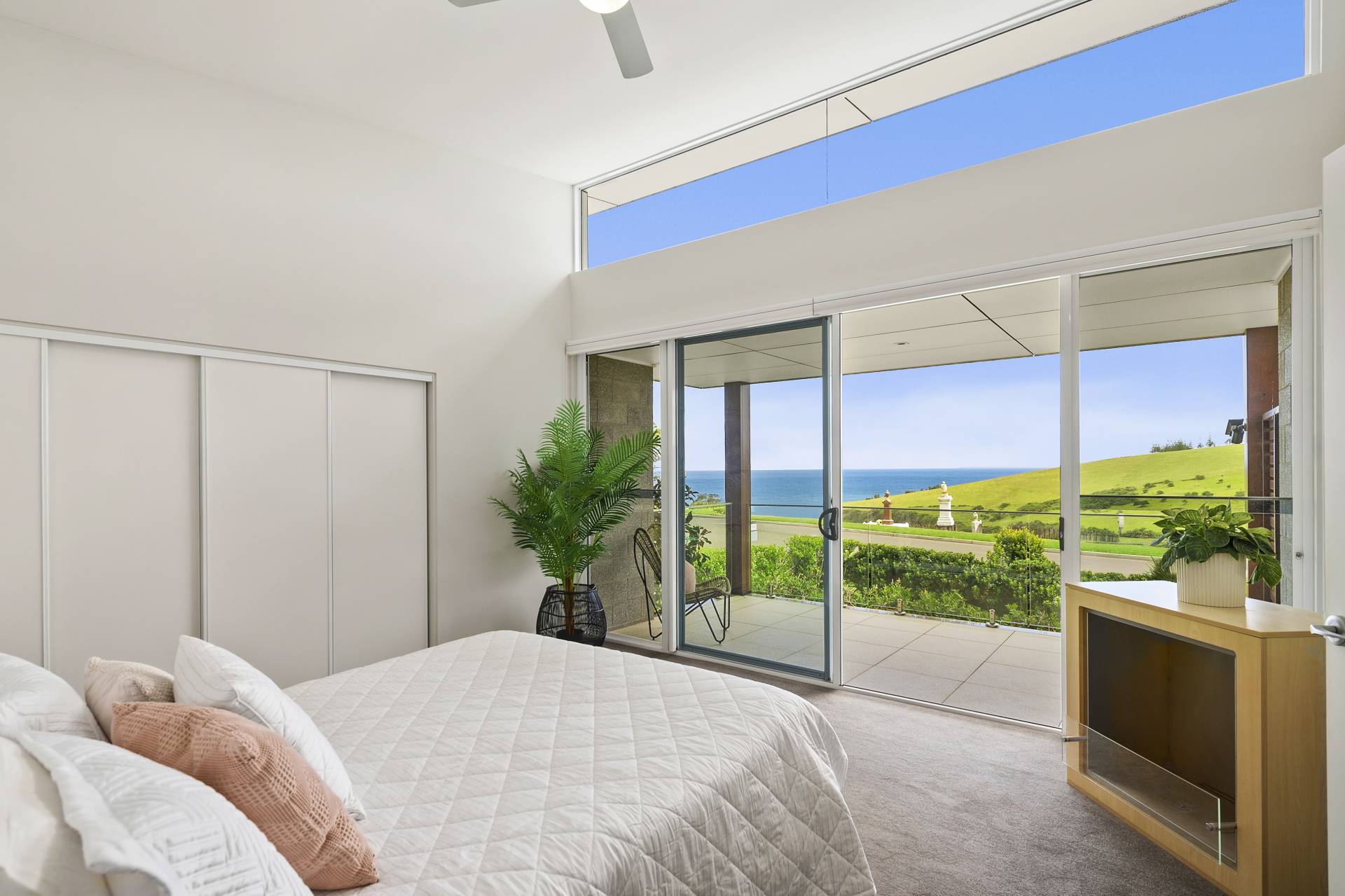 A half flight of stairs leads to the principal bedroom suite — a private retreat designed for indulgence. Double doors reveal a generous space complete with built‑in storage, a deep freestanding bathtub, and a private terrace capturing views across the headland to the ocean. A freestanding bioethanol fireplace adds warmth and ambience, creating a haven for relaxation throughout the cooler months.